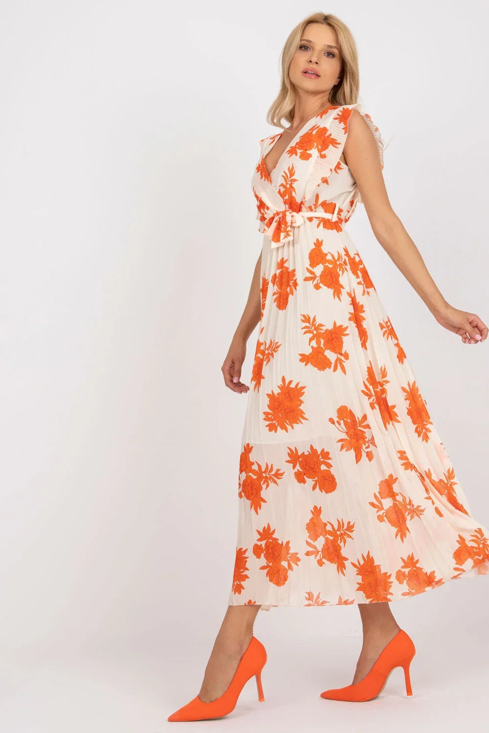 Dlouhé šaty s krátkými rukávy ve tvaru volánu. Zavazování v pase, plisovaná spodní část šatů. Perfektní letní nabídka.