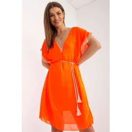Volné šaty s krátkými rukávy a srdíčkovým výstřihem. Šaty jsou podšité, zavazují se v pase. Šaty s ažurovými vsadkami.