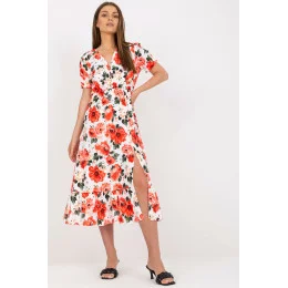 Letní šaty z květované látky s krátkými rukávy. Zapínání vpředu na knoflíky, dole s rozparkem a volánkem.