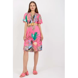 Letní šaty s krátkými rukávy, obálkovým výstřihem a rozšířenou spodní částí. Plisovaná spodní část šatů. Šaty s pleteným páskem jsou součástí balení. Skvěle se hodí pro mnoho příležitostí.