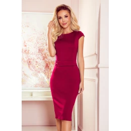 Elegantní midi šaty s páskem a krátkými rukávy v lahvově zelené barvě. Vyrobeno ze silnější, na dotek příjemné, mírně elastické látky bez podšívky. Zapínání na zádech na krytý zip. Značka Numoco. Polský výrobek.