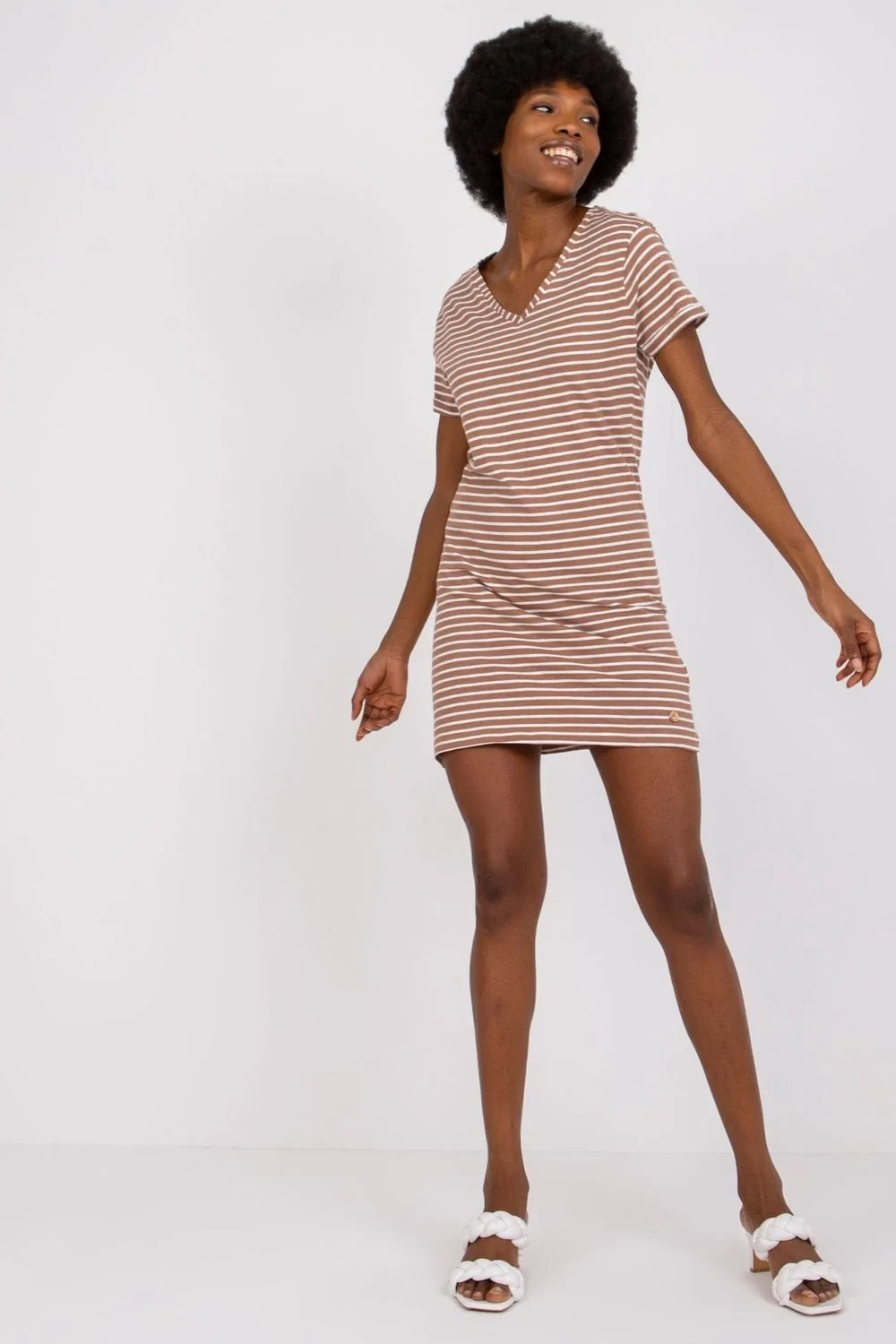 Letní šaty s krátkými rukávy z pruhované látky. Ideální pro každodenní nošení.