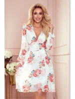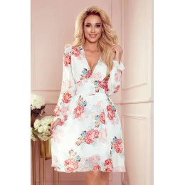 Šifonové šaty s dlouhými rukávy a výstřihem. Šaty z látky se vzorem slézu na bílém pozadí. Značka numoco. Polská produkce.