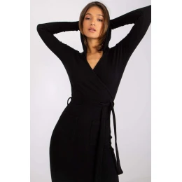 Šaty vypasovaného střihu s dlouhými rukávy. Šaty s kapucí, vyrobené z žebrované tkaniny. Obálkový výstřih, zavazovací pásek v pase, kapsy na přední straně. Návrh pro mnoho příležitostí.