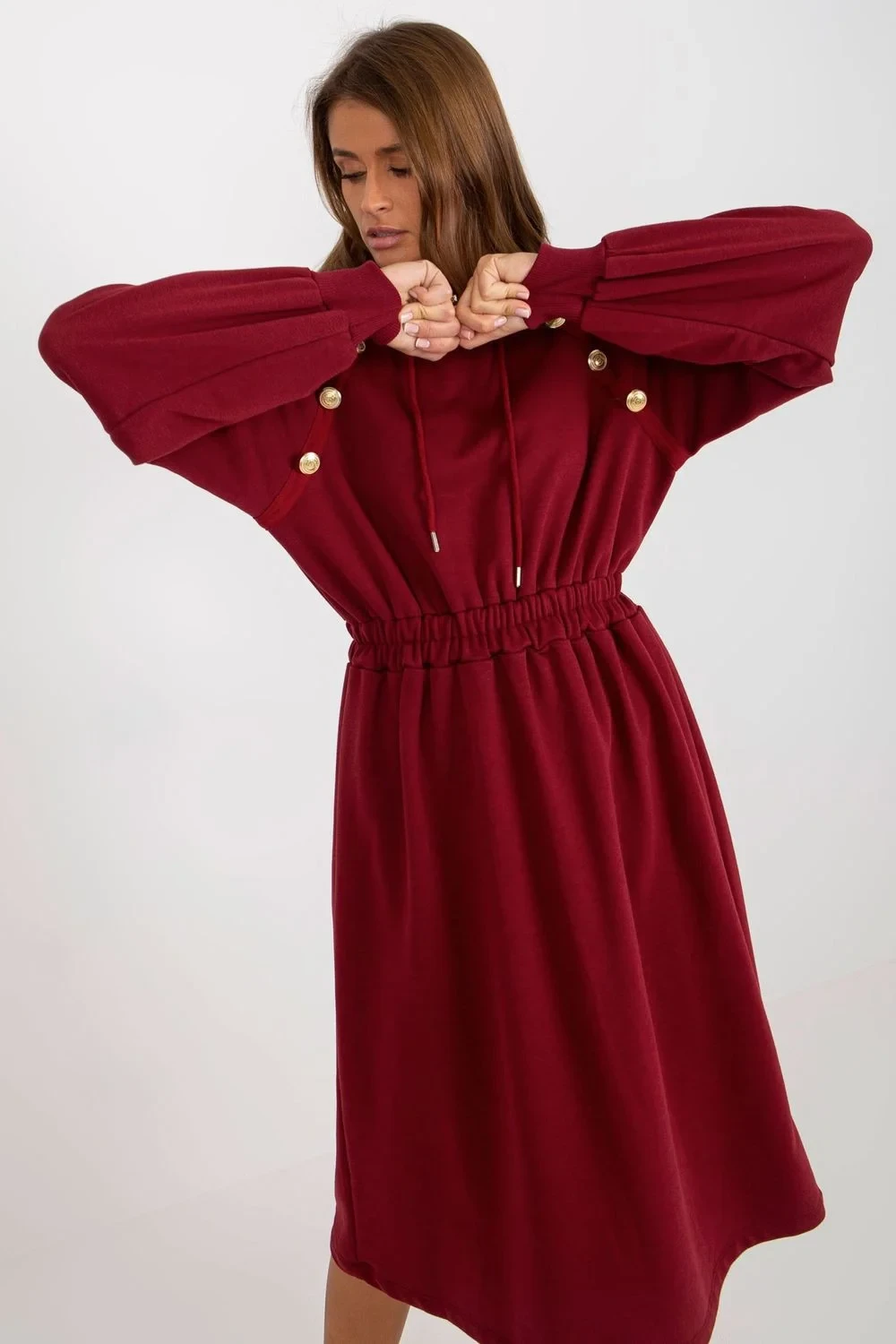 Mikinové šaty s dlouhými rukávy a kapucí. Elastický pas, ozdobné knoflíky na přední straně. Každodenní nabídka.