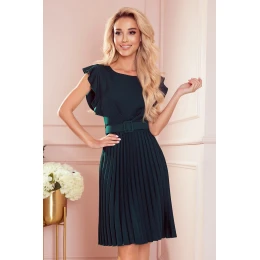 Plisované šaty s páskem a záhyby. Zapínání na zádech na krytý zip. Šaty v lahvově zelené barvě. Značka numoco. Polská produkce.