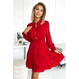 Červené šaty s volánky, dlouhými rukávy, výstřihem a zlatými knoflíky. Polská produkce. Značka Numoco.