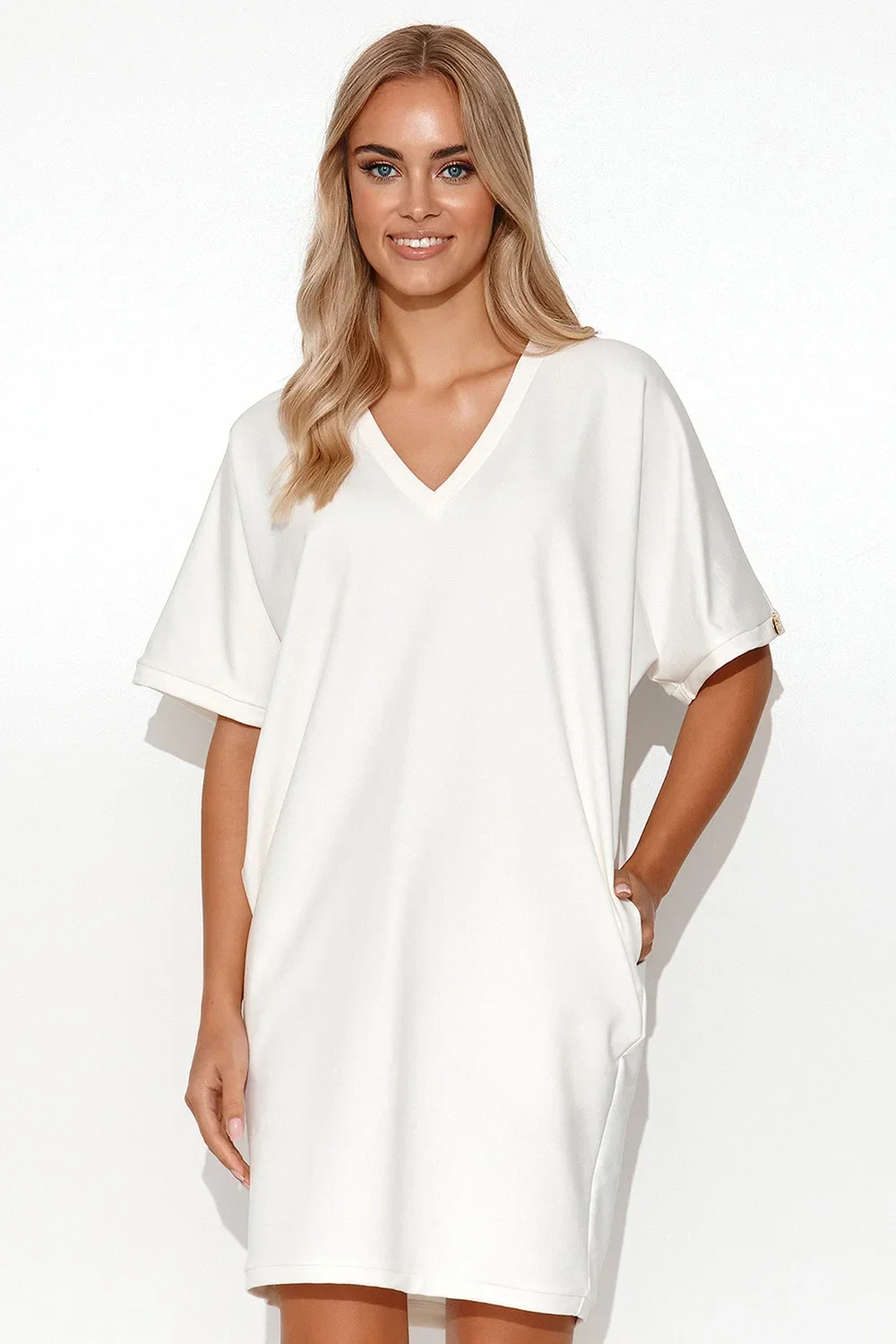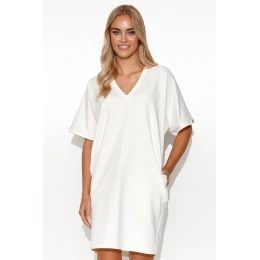 Mimořádně ležérní, minimalistické mikinové kimonové šaty. Jejich délka zdůrazňuje nohy, takže se skvěle hodí k botám. Drzý výstřih odhaluje klíční kosti a vytváří prostor pro krásné šperky. Na bocích jsou nakládané kapsy. Šaty umožňují volnost pohybu. Dámy s postavou typu jablko se v nich budou cítit skvěle. Šaty maskují oblast břicha a opticky prodlužují krk. Krátké kimonové rukávy nezdůrazňují odhalující spodní prádlo. Díky tomu působí tepláky žensky a elegantně.
