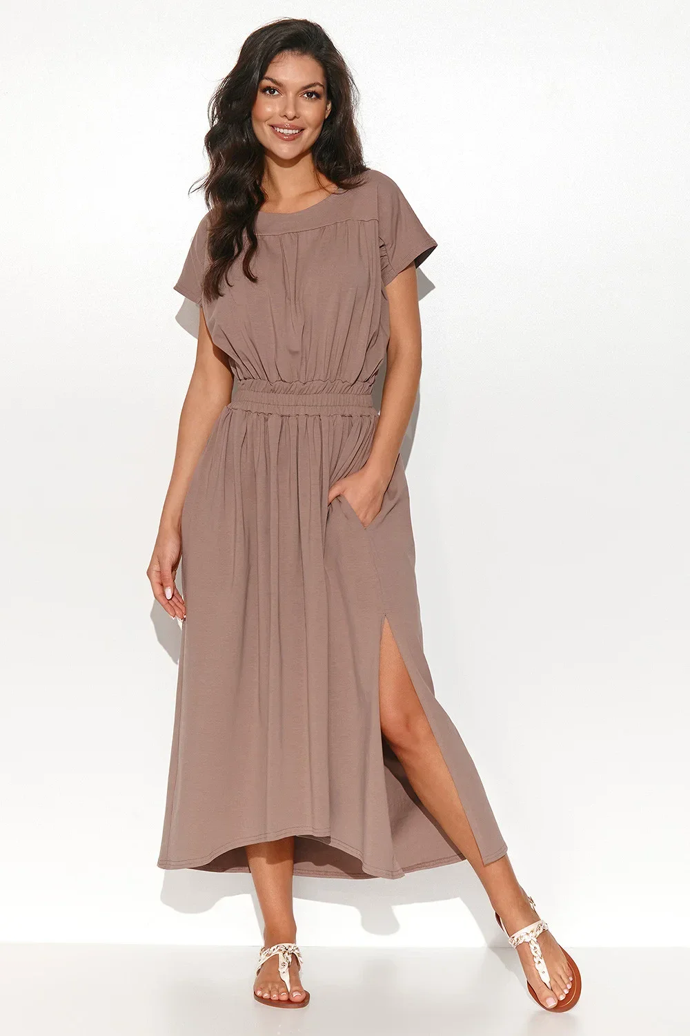Dlouhé asymetrické šaty ušité z úpletové teplákoviny. Mají kulatý výstřih a v pase jsou opatřeny stahovací gumou. Zadní část šatů je o něco delší než přední, díky čemuž ležérní kreace vypadá na siluetě zajímavě. Téměř po celé délce mají šaty jemné řasení. Na bocích jsou postranní nakládané kapsy. Kulatý výstřih ponechává prostor pro krásný řetízek. Krátké rukávy naopak maskují ramínka spodního prádla. Oblečte si je k oblíbeným botám nebo sandálům a užijte si ležérní, ale elegantní vzhled.