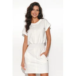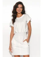 Krátké šaty z mikinového úpletu. Pohodlný ležérní střih se stahovací šňůrkou v pase. Obsahují dvě boční kapsy. Na jedné z nich se nachází půvabná zlatá destička. Kulatý výstřih a krátké rukávy dodávají šatům minimalistický a univerzální vzhled. Jedná se o mimořádně půvabnou každodenní kreaci, kterou lze stylizovat mnoha způsoby. Sportovně, elegantně i pracovně, jak se vám zlíbí. Oblečte si je k teniskám, přibalte k nim lehké dámské sako a vyrazte s přáteli na nákupy nebo vezměte děti na spontánní piknik. V každé situaci budou tyto šaty perfektně fungovat.