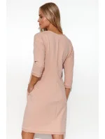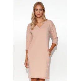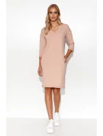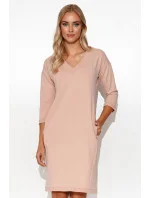 Teplákové šaty jednoduchého, ležérního střihu. Mají hluboký výstřih do V, 3/4 rukávy a praktické boční kapsy. Na jedné z nich je našitý ozdobný zlatý štítek. Šaty mají žebrované lemy, které dodávají sportovní nádech. Zadní díl šatů je hladký, se skrytým švem umístěným uprostřed. Perfektní letní volba, kterou můžete nosit s lehkými teniskami nebo sportovními sandály pro aktivní den.