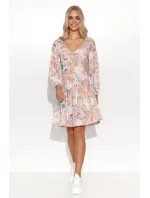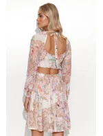 Vzdušné šaty s extrémně dívčím střihem. Mají dlouhé, lehce nařasené rukávy. Vpředu je vidět poměrně velký výstřih, látka je na prsou nabraná. Uprostřed je našitý kousek látky, který imituje mašli. Na zadní straně šatů je zavazování spolu se zavazováním. Ačkoli jsou záda viditelná, součástí šatů je další pruh látky, který zakrývá spodní prádlo. Díky tomu můžete k této kreaci nosit podprsenku. To znamená, že tento dívčí střih šatů je určen i pro dámy s větším poprsím. V linii pasu je rovněž přítomna stahovací guma. Spodní část šatů je ušitá z pevného materiálu. Horní část je naopak ze vzorované síťoviny, která je k dispozici ve třech variantách lišících se barvou a motivem.