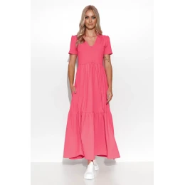 Šaty jsou bezpochyby jedním z nejženštějších kousků ženského šatníku. Není divu, jsou to právě ony, které dodávají šarm a dívčí půvab. Pletené maxi šaty byly ušity ve velmi klasickém střihu, který z téměř každé ženy udělá přesýpací hodiny. Příjemný úplet poskytuje pocit volnosti, krátký rukáv zakrývá ramena v jejich nejširších partiích. Výstřih do V prodlužuje krk, zatímco lem v pase zdůrazňuje nejštíhlejší partie ženské postavy a dodává jí lehkost. Lehké volánky, umístěné na několika místech po celé délce šatů, dodají každému oblečení romantický nádech. Maxi šaty v jednobarevném provedení nepotřebují mnoho doplňků, ačkoli jich také mnoho rády přijmou. Vyzkoušejte sportovní styl s oblíbenou ledvinkou a teniskami nebo elegantní s lodičkami na podpatku a kabelkou se spojkou.