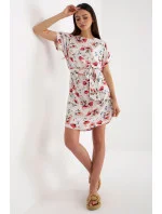 Letní šaty s krátkými rukávy a kulatým výstřihem. Pásek na zavázání v pase. Šaty z látky se zajímavým květinovým vzorem.