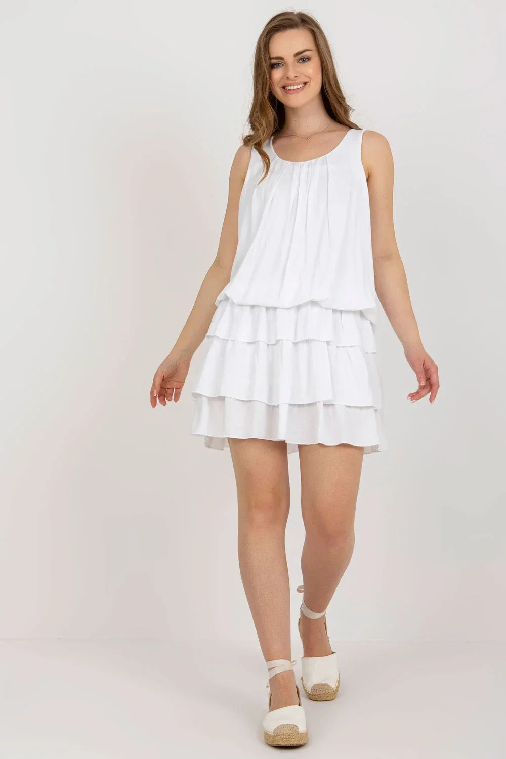 Letní šaty bez rukávů s kulatým výstřihem. Podšité šaty s elastickým pasem a volánky.