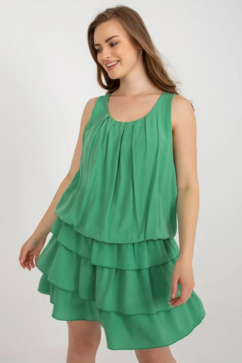 Letní šaty bez rukávů s kulatým výstřihem. Podšité šaty s elastickým pasem a volánky.