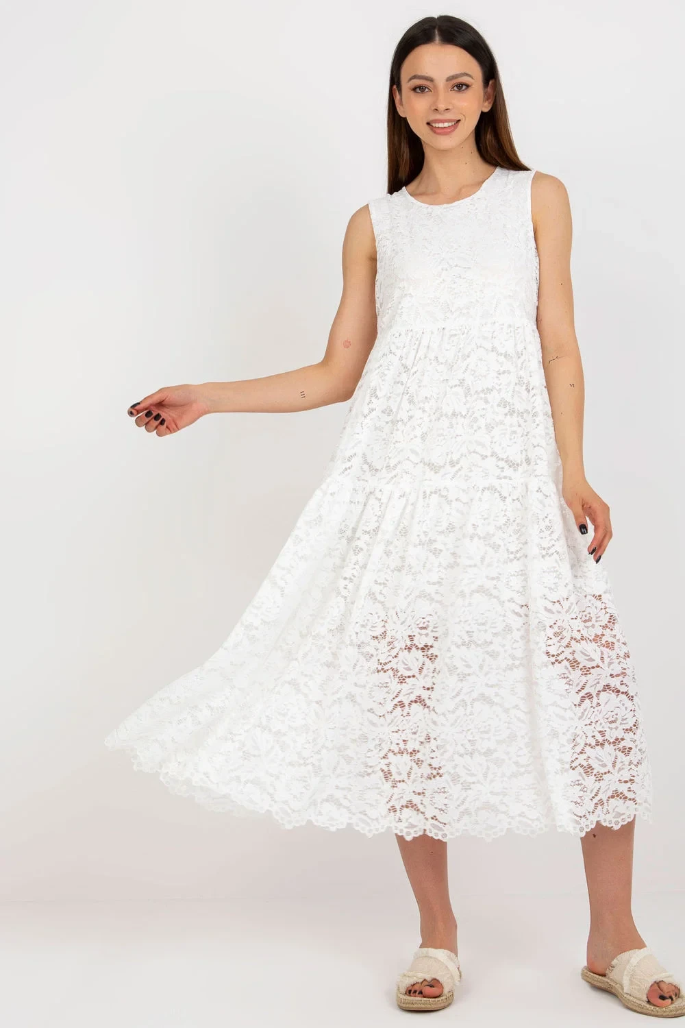 Ažurové šaty bez rukávů s rozšířeným střihem. Šaty mají podšívku.