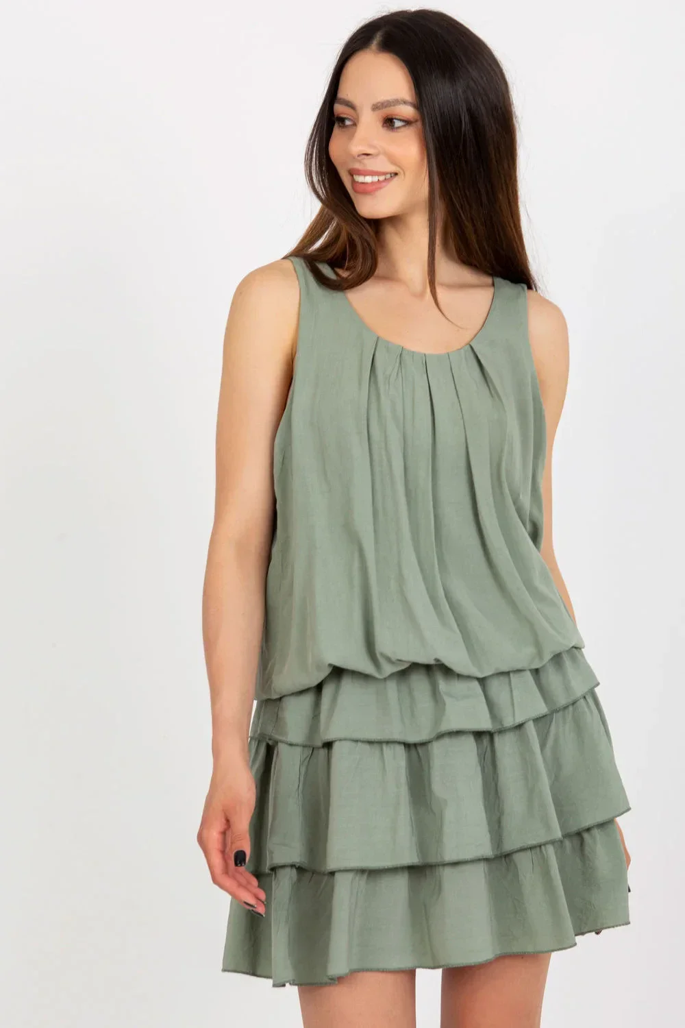 Letní šaty bez rukávů s kulatým výstřihem. Podšité šaty s elastickým pasem a volánky.