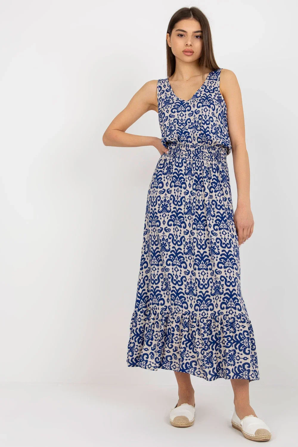 Dlouhé letní šaty se silnějšími ramínky a srdíčkovým výstřihem. Pružný pas, volánový lem.