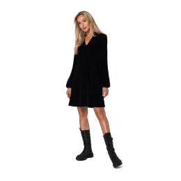Velurové šaty s dlouhými rukávy a výstřihem do V. Šaty mají trapézový střih, bez podšívky. Navrženo a ušito v Polsku.