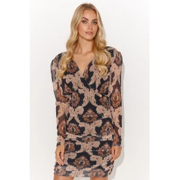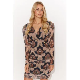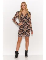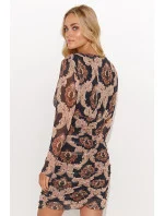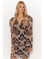 Mini šaty ušité ze síťoviny s podšívkou. Mají lehce nařasené dlouhé rukávy. K dostání ve 4 vzorech se zajímavými motivy a v různých barvách. Šaty jsou přiléhavé k tělu a mírně řasené. Na předním díle mají ozdobný třpyt. Mají výstřih do V a přestřižení pod prsy. Jsou ideální volbou na setkání s přáteli, rande nebo večírek. Díky vypasovanému střihu a mírnému řasení šaty zvýrazní vaši siluetu. Volbou správných doplňků, jako jsou jemné šperky a módní boty, vytvoříte okouzlující a stylový vzhled pro různé příležitosti.