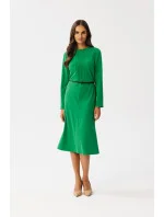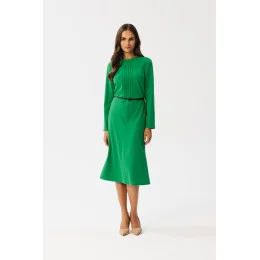 Tyto šaty vynikají ozdobným prošíváním ve výstřihu, které jim dodává na půvabu. Přestřižení v pase zvýrazňuje pas a přiložený pásek z umělé kůže je stylovým doplňkem. Dlouhé rovné rukávy jsou univerzální a módní. Spodní část šatů je střižena se šikmým lemem s prošitím uprostřed pro odlehčený vzhled. Díky délce pod kolena jsou šaty vhodné pro mnoho příležitostí. Krytý zip na zádech usnadňuje oblékání. Šaty jsou bez podšívky pro pohodlné nošení. Jedná se o šaty, které byly navrženy a ušity v Polsku, což svědčí o jejich kvalitě a jedinečnosti. Dodají vám sebevědomí a styl pro různé příležitosti.