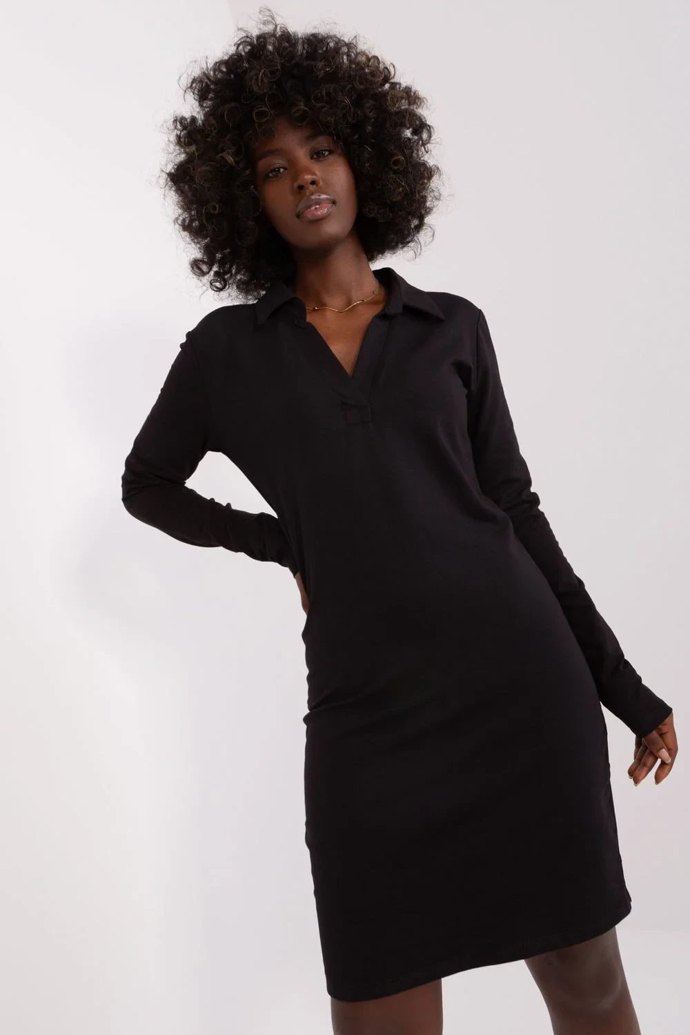 Lehce střižené šaty s dlouhými rukávy a výstřihem do V s límečkem. Ideální pro každodenní nošení.