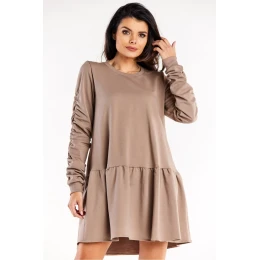 Volné šaty s dlouhými rukávy, kulatým výstřihem a nařaseným lemem. Rukávy s ozdobnými záhyby.