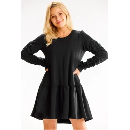Volné šaty s dlouhými rukávy, kulatým výstřihem a nařaseným lemem. Rukávy s ozdobnými záhyby.