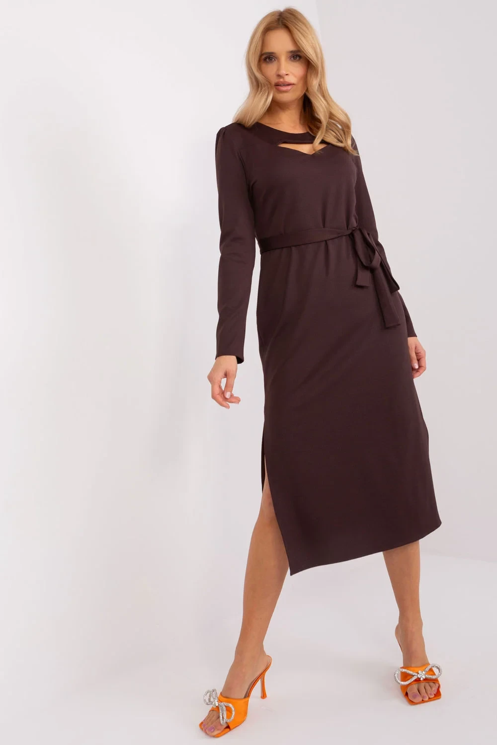 Tyto elegantní šaty rovného střihu se hodí k různým příležitostem. Díky klasickému střihu se hodí jak na pracovní schůzky, tak na formálnější výlety. Šaty jsou vyrobeny z látky s pestrou žebrovanou strukturou, která jim dodává jemný nádech. Dlouhé rukávy a kulatý výstřih s průstřihem dodávají šatům jedinečný vzhled, zatímco dodatečný pásek na zavázání zvýrazňuje pas. Díky midi délce jsou šaty pohodlnou volbou pro všechna roční období.