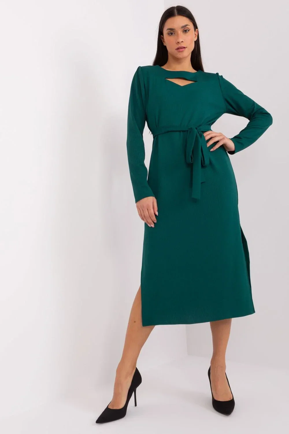 Tyto elegantní šaty rovného střihu se hodí k různým příležitostem. Díky klasickému střihu se hodí jak na pracovní schůzky, tak na formálnější výlety. Šaty jsou vyrobeny z látky s pestrou žebrovanou strukturou, která jim dodává jemný nádech. Dlouhé rukávy a kulatý výstřih s průstřihem dodávají šatům jedinečný vzhled, zatímco dodatečný pásek na zavázání zvýrazňuje pas. Díky midi délce jsou šaty pohodlnou volbou pro všechna roční období.