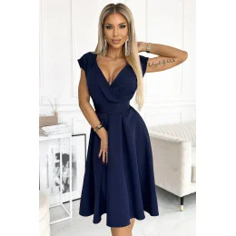 Rozšířené šaty s obálkovým výstřihem a páskem. Vyrobeno z materiálu příjemného na dotek (95 % polyester, 5 % elastan). Šaty v tmavě modré barvě. Značka numoco. Polská výroba.