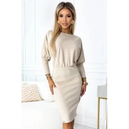 Pruhované šaty s žebrovanými manžetami. Šaty v béžové barvě. Vyrobeno z příjemného na dotek, elastického materiálu. Polská výroba. Značka numoco.