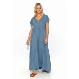 Viskózové šaty jsou vzdušné, ležérní a stále velmi módní. Naše maxi šaty volného střihu mají na dvou místech prošití, které vytváří nápadný záhyb. Výstřih do V krásně odhaluje poprsí a klíční kosti. Další zajímavostí je minimalistická pozlacená kovová destička všitá do zadní části šatů. Tento model je dokonalým návrhem na ležérní outfit, který lze doplnit sportovní obuví, sandály nebo kozačkami. Ženy, které ocení ležérní styl, pohodlí a nadčasovost, si tyto šaty jistě zamilují.
