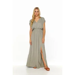 Dlouhé lehké úpletové šaty jsou ideální volbou pro letní dny a poskytují nejen volnost, ale také vyjádření osobního stylu. Srdíčkový výstřih a zavazování na zádech dodávají šatům jemnost a ženský půvab a zároveň zvýrazňují krk a záda. V pase je šňůrka, která jemně zvýrazňuje pas a dodává šatům lehkost a eleganci. Rozparky vpředu dodávají kreaci nádech extravagance, zvýrazňují ženskou siluetu a zároveň poskytují praktický prvek. Krátký šňůrkový rukáv zdobený zlatou destičkou dodává šatům nádech elegance a jedinečnosti. Šaty jsou k dispozici v různých barvách, například v šedé, olivové, zemitě hnědé, džínové, černé a béžové, což vám umožní vybrat si odstín podle vašich individuálních potřeb a nálady. Skvěle se hodí pro různé příležitosti, od každodenních procházek až po večery s přáteli. Veškeré stylistické kouzlo se skrývá v detailech.