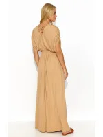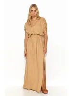 Dlouhé lehké úpletové šaty jsou ideální volbou pro letní dny a poskytují nejen volnost, ale také vyjádření osobního stylu. Srdíčkový výstřih a zavazování na zádech dodávají šatům jemnost a ženský půvab a zároveň zvýrazňují krk a záda. V pase je šňůrka, která jemně zvýrazňuje pas a dodává šatům lehkost a eleganci. Rozparky vpředu dodávají kreaci nádech extravagance, zvýrazňují ženskou siluetu a zároveň poskytují praktický prvek. Krátký šňůrkový rukáv zdobený zlatou destičkou dodává šatům nádech elegance a jedinečnosti. Šaty jsou k dispozici v různých barvách, například v šedé, olivové, zemitě hnědé, džínové, černé a béžové, což vám umožní vybrat si odstín podle vašich individuálních potřeb a nálady. Skvěle se hodí pro různé příležitosti, od každodenních procházek až po večery s přáteli. Veškeré stylistické kouzlo se skrývá v detailech.