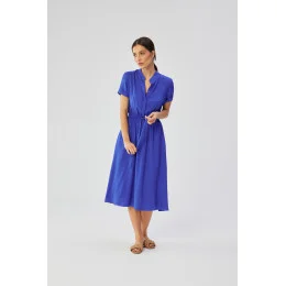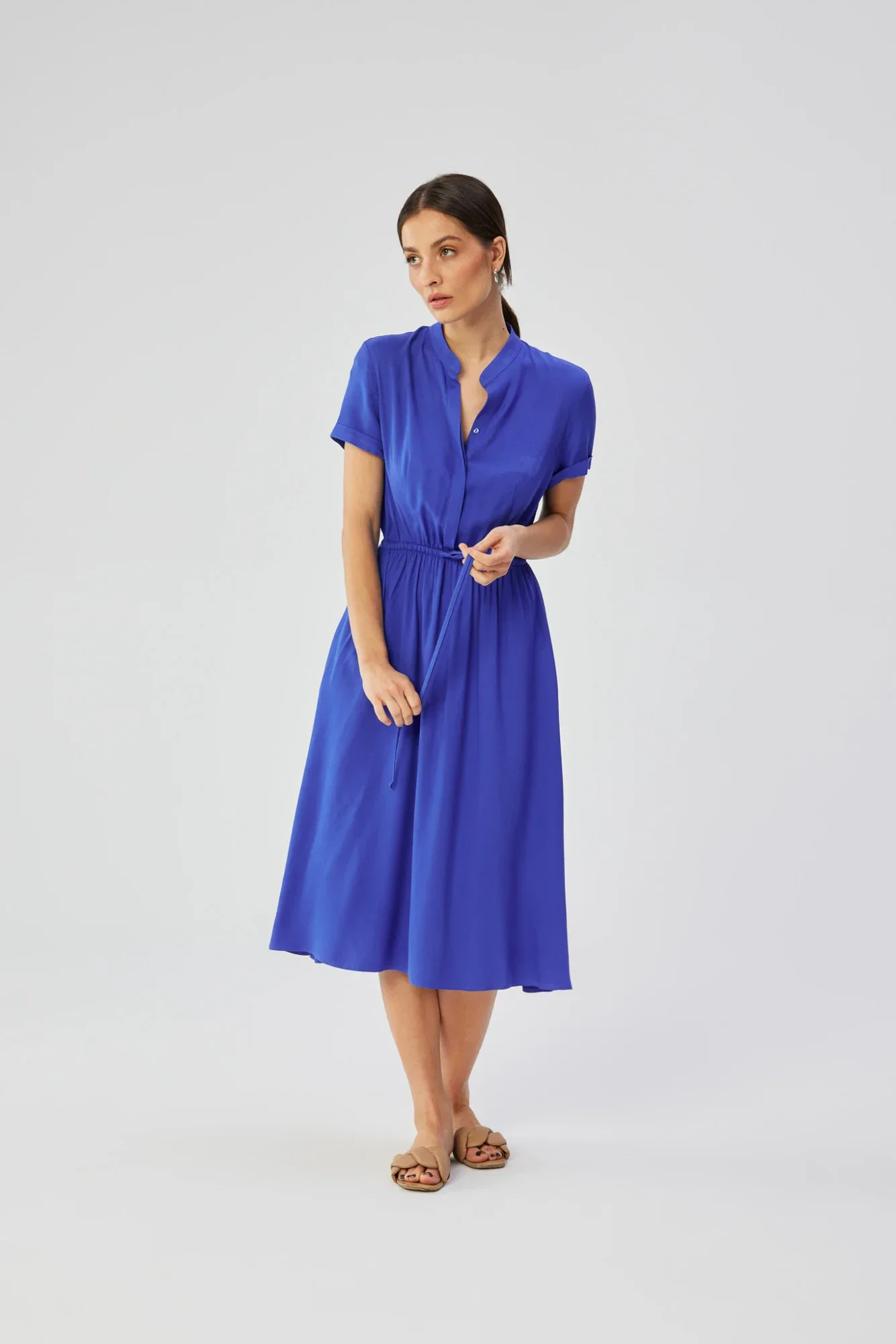 Tyto šaty z vysoce kvalitní viskózové tkaniny, vyrobené výhradně v Polsku, jsou kombinací elegance, pohodlí a místního řemeslného umění. Tkanina ze 100% viskózy zaručuje měkkost, jemnost a potěšení z nošení a zároveň vytváří mírně rozšířený střih šatů. V pase mají šaty stahovací šňůrku, která jemně zvýrazní ženské křivky a přizpůsobí je individuálním preferencím. Horní část šatů se rozepíná, což usnadňuje jejich oblékání a svlékání a dodává jim prvek praktičnosti. Pod krkem je stojáček, který šatům dodává sofistikovaný nádech. Krátké rukávy s mírným ohrnutím dodávají šatům lehký a svěží nádech a dokonale se hodí k letním stylům. Za zmínku stojí, že šaty nemají žádnou podšívku, díky čemuž látka dokonale přiléhá k tělu a zároveň zůstává lehká a vzdušná. Navrhování a šití v Polsku klade důraz na místní výrobu, což je další výhoda pro uvědomělé spotřebitele, kteří oceňují vysokou kvalitu a podporu místního řemesla.