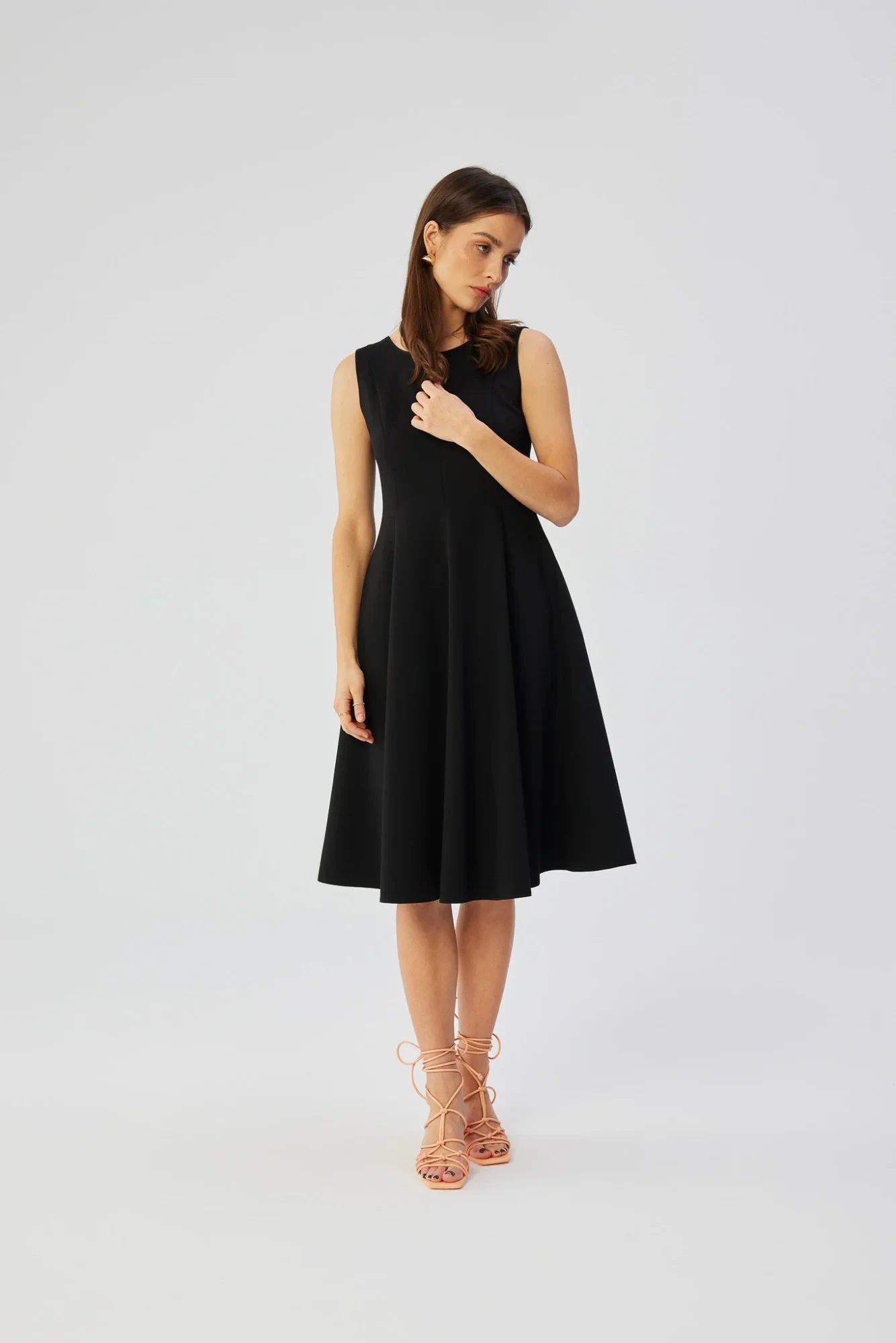 Vstupujeme do světa polského designu a představujeme jedinečné šaty, které vyzařují styl, eleganci a pečlivé řemeslné zpracování. Tento jedinečný výtvor byl navržen a ušit v Polsku s důrazem na detail a individualitu. Šaty bez rukávů zaujmou vypasovaným střihem v horní části, který zdůrazňuje půvaby postavy, aby se později směrem dolů jemně rozšířily. Silně naznačený pas dodává šatům ženský půvab a neobyčejnou eleganci, díky níž se každá žena, která je nosí, cítí výjimečně. Podlouhlé zeštíhlující prošití dodává šatům jemné tvarování a zvýrazňuje přednosti postavy. Kulatý výstřih vpředu dodává šatům klasický vzhled, zatímco výstřih do V na zádech dodává šatům nádech smyslné rafinovanosti. Skrytý zip umístěný na zádech poskytuje elegantní a zároveň praktický způsob, jak šaty obléknout. Jako bonus přidávají boční kapsy šatům ležérní nádech a činí z nich praktickou a pohodlnou volbu. Šaty sahají nad kolena, takže jsou ideální volbou pro mnoho příležitostí, jak formálnějších, tak ležérnějších. Navzdory své eleganci nemají šaty žádnou podšívku, takže jsou lehké, vzdušné a ideální pro teplejší dny. Jsou skutečným dílem krejčovského umění, z něhož vyzařuje polské řemeslo a tradice.