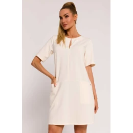 Tyto pletené šaty jsou jedinečným výrobkem, který byl navržen a vyroben s důrazem na detail v Polsku a který podtrhuje vysokou kvalitu a styl polského krejčovství. Šaty mají áčkový střih, který jim dodává lehkost a zároveň zvýrazňuje ženskou siluetu. Jemný výstřih dodává šatům jemnost a vytváří harmonickou rovnováhu mezi elegancí a každodenním pohodlím. Díky krátkým rukávům jsou šaty ideální pro teplejší dny a dodávají celkovému vzhledu lehkost. Praktické boční kapsy skryté ve švech na přední straně šatů jsou nejen funkční, ale také dodávají nonšalanci a městský nádech. Ozdobný štítek s logem umístěný na jedné z kapes je elegantním dekorativním prvkem, který podtrhuje jedinečnost šatů. Za zmínku stojí, že šaty nemají podšívku, díky čemuž jsou lehké a vzdušné, ideální pro letní dny. Tento oděv nejen podtrhuje polský design a krejčovskou tradici, ale také spojuje funkčnost, pohodlí a módní styl. Tyto šaty jsou vynikající volbou pro ženy, které hledají jedinečný kousek oblečení, ideální jak pro každodenní nošení, tak pro zvláštní příležitosti.
