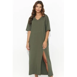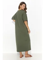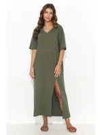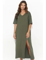 Volné dlouhé šaty s krátkými rukávy dodávají šarm a nadčasový styl. Šaty zaujmou rozparkem v přední části, který jim dodává nádech jemné elegance, a v pase jsou zdobeny ozdobnou zlatou destičkou, která jemně upoutá pozornost na ženskou siluetu. Srdíčkový výstřih zdůrazňuje krk a klíční kosti a dodává šatům ženský půvab. Zároveň velmi ležérní střih činí z šatů ideální volbu pro letní dny, která zaručuje nejen dokonalý vzhled, ale také pohodlí. Šaty jsou k dispozici v různých barvách a jsou ideální volbou pro ženy, které si cení pohodlí a módy bez ohledu na trendy.