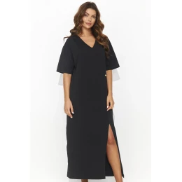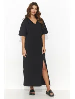 Volné dlouhé šaty s krátkými rukávy dodávají šarm a nadčasový styl. Šaty zaujmou rozparkem v přední části, který jim dodává nádech jemné elegance, a v pase jsou zdobeny ozdobnou zlatou destičkou, která jemně upoutá pozornost na ženskou siluetu. Srdíčkový výstřih zdůrazňuje krk a klíční kosti a dodává šatům ženský půvab. Zároveň velmi ležérní střih činí z šatů ideální volbu pro letní dny, která zaručuje nejen dokonalý vzhled, ale také pohodlí. Šaty jsou k dispozici v různých barvách a jsou ideální volbou pro ženy, které si cení pohodlí a módy bez ohledu na trendy.