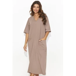 Dlouhé ležérní šaty s krátkými rukávy a výstřihem do V dokonale kombinují pohodlí s klasickou každodenní elegancí. Šaty mají na přední straně dvě praktické kapsy a na jedné z nich je navíc akcent v podobě zlatého pozlátka, které jim dodává jemný lesk. Jednoduché a elegantní šaty jsou dokonalou každodenní volbou pro pohodlí a nadčasový styl. Jsou k dispozici v několika barvách, což umožňuje přizpůsobit odstín vašim osobním preferencím. Vytvořte si s nimi univerzální vzhled pro různé příležitosti. Je to oděv, který podtrhne vaši osobnost a dodá vám sebevědomí. Perfektní kombinace s plochými sandály nebo espadrilkami.