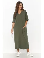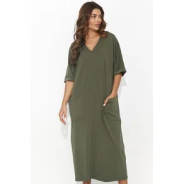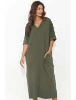 Dlouhé ležérní šaty s krátkými rukávy a výstřihem do V dokonale kombinují pohodlí s klasickou každodenní elegancí. Šaty mají na přední straně dvě praktické kapsy a na jedné z nich je navíc akcent v podobě zlatého pozlátka, které jim dodává jemný lesk. Jednoduché a elegantní šaty jsou dokonalou každodenní volbou pro pohodlí a nadčasový styl. Jsou k dispozici v několika barvách, což umožňuje přizpůsobit odstín vašim osobním preferencím. Vytvořte si s nimi univerzální vzhled pro různé příležitosti. Je to oděv, který podtrhne vaši osobnost a dodá vám sebevědomí. Perfektní kombinace s plochými sandály nebo espadrilkami.