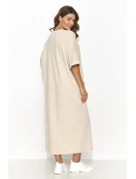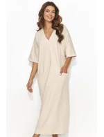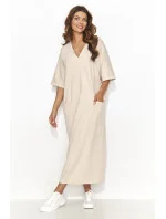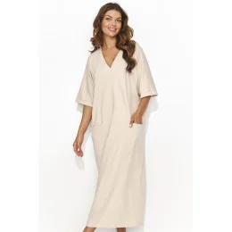 Dlouhé ležérní šaty s krátkými rukávy a výstřihem do V dokonale kombinují pohodlí s klasickou každodenní elegancí. Šaty mají na přední straně dvě praktické kapsy a na jedné z nich je navíc akcent v podobě zlatého pozlátka, které jim dodává jemný lesk. Jednoduché a elegantní šaty jsou dokonalou každodenní volbou pro pohodlí a nadčasový styl. Jsou k dispozici v několika barvách, což umožňuje přizpůsobit odstín vašim osobním preferencím. Vytvořte si s nimi univerzální vzhled pro různé příležitosti. Je to oděv, který podtrhne vaši osobnost a dodá vám sebevědomí. Perfektní kombinace s plochými sandály nebo espadrilkami.