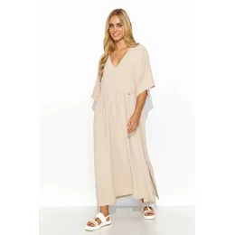Dlouhé šaty nadměrné velikosti se zavazováním na zádech. Jsou vyrobeny z lehké a velmi vzdušné látky, díky čemuž se skvěle hodí do teplých jarních a letních dnů. Na přední straně šatů je na levé straně u spojení látek stylový třpyt, který dodává celému vzhledu šarm. Šaty mají hluboký výstřih ve tvaru písmene V, takže všechny nošené šperky budou viditelné a pěkně vyniknou. Délka rukávů sahá až k lokti. Naše dlouhé šaty jsou ideální na romantickou schůzku s partnerem nebo na významnou rodinnou událost.