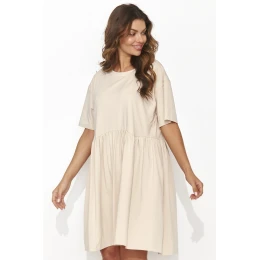 Ležérní mini šaty s jedinečným šarmem, které mají na přední straně našitou elegantní zlatou destičku. Kreace s krátkými rukávy a ležérním střihem vyzařuje dívčí půvab. Kulatý výstřih dokonale podtrhuje bezstarostný vzhled a dodává lehkost a volnost. Tyto šaty, které jsou k dispozici v barvách moka, světle béžové, krémové, čokoládové a černé, jsou ideální volbou pro každodenní nošení a dodají styl každodenním aktivitám. Skvěle se uplatní v práci, ale i při setkání s přáteli. Vše je jen otázkou doplňků. Je to kombinace pohodlí, elegance a dívčí jemnosti a velmi pohodlný každodenní styl.