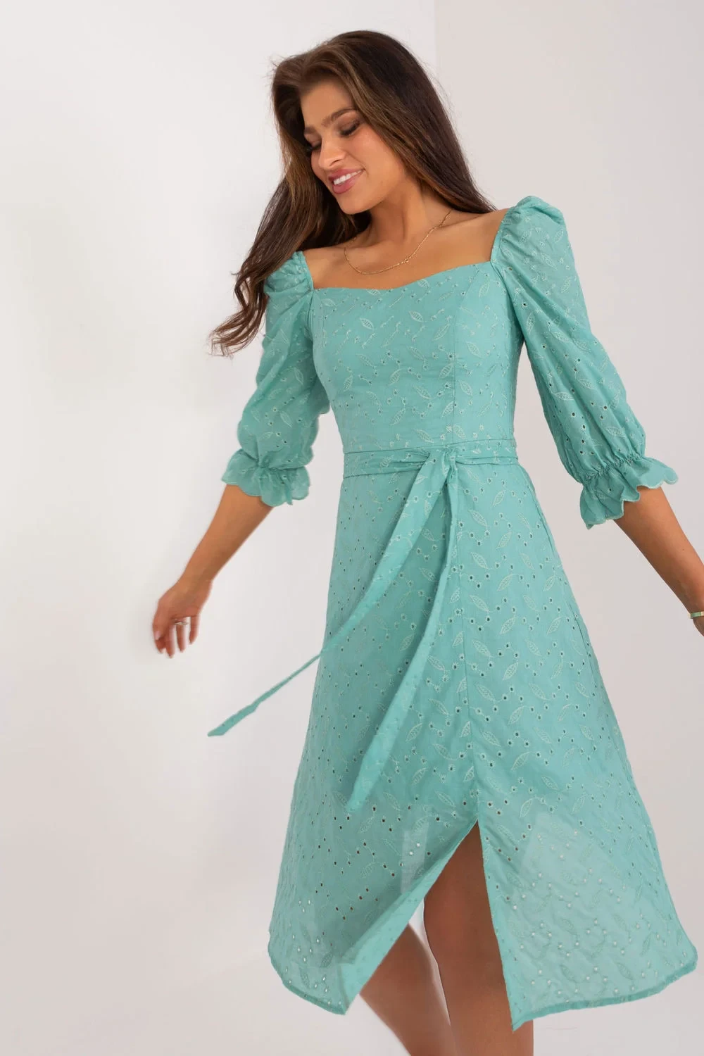 Tyto letní šaty vyzařují svěžest a lehkost a jsou ideální pro každodenní nošení během teplých dnů. Jejich rozšířený střih jim dodává na půvabu a zajišťuje pohodlné nošení, které umožňuje pokožce dýchat. Šaty jsou vyrobeny ze vzdušné bavlny a zaručují pohodlí i v těch nejteplejších dnech. Jejich midi délka dodává elegantní vzhled při zachování volnosti pohybu. Krátké rukávy s jemným volánkem dodávají celému vzhledu lehkost a jemnost. Obdélníkový výstřih zvýrazňuje krk a dodává mu jemnost. Šaty se zapínají na krytý zip pro snadné oblékání a svlékání. Jemná ozdobná výšivka na látce dodává šatům jedinečný půvab a snadno upoutá pozornost. Šaty mají navíc podšívku pro větší pohodlí a zabránění jakémukoli prosvítání. Nafouklé rukávy dodávají šatům romantický nádech a činí celý styling lehkým a půvabným. Pásek na zavázání zvýrazňuje pas a dodává šatům tvar a eleganci. Jsou ideální volbou na letní procházky, setkání s přáteli nebo večerní vycházky, zaručují pohodlí a styl zároveň.