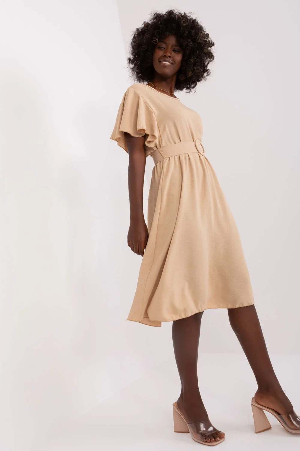 Mírně rozšířené letní šaty s krátkými volánkovými rukávy a kulatým výstřihem. Doplněné páskem ve stejné barvě.