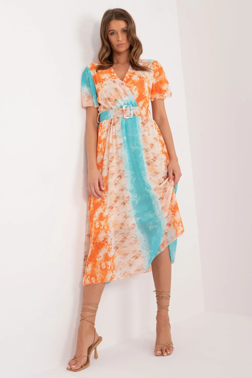 Tyto šaty jsou ideální volbou pro každodenní nošení a kombinují pohodlí s osobitým stylem. Jsou vyrobeny z látky zdobené barevným potiskem a dodají každému kompletu svěžest a energii. Krátké rukávy poskytují volnost pohybu a midi délka dodává šatům univerzální charakter, který se skvěle hodí pro různé příležitosti. Jako každodenní šaty byly navrženy s ohledem na pohodlí a funkčnost. Jsou vybaveny páskem se zapínáním na přezku, který zvýrazňuje pas a dodává siluetě ženský tvar. Šaty jsou navíc podšité pro větší pohodlí a lepší padnutí. Díky rovnému střihu se snadno stylizují a hodí se jak pro běžné, tak pro formálnější příležitosti. Tyto šaty se skvěle hodí na setkání s přáteli, na nákupy nebo na procházku a díky nim bude každý den plný stylu a sebevědomí.