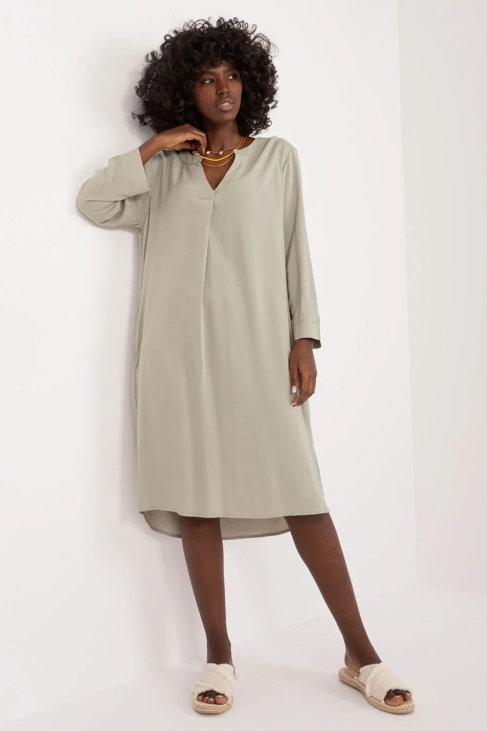 Tento každodenní šaty spojují pohodlí a styl. Jsou vyrobeny z kvalitní viskózy, jsou lehké a prodyšné, ideální na každý den. Oversize střih zajišťuje volnost pohybů a pohodlí nošení, a jednolitý materiál dodává elegantní, minimalistický vzhled. Oblek sahá za koleno, co z něj dělá vhodný k práci i setkáním s přáteli. Výstřih v šíji dodává ženský šarm a praktické vložené kapsy v bočních švech jsou pohodlným a funkčním doplňkem. Tyto šaty jsou skvělou volbou pro ženy, které oceňují styl a pohodlí na každý den.